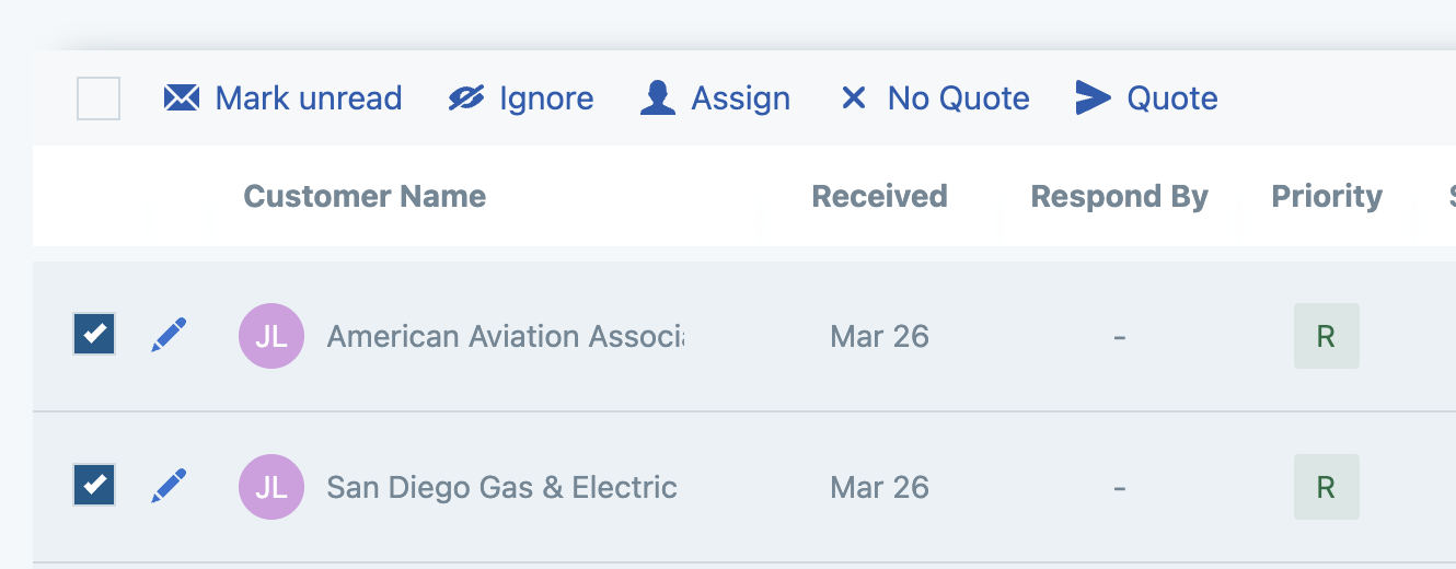 Each view has the same general functionality, but there are different actions available depending on the deal stage you are in. For example, the RFQ Inbox has a āNo Quoteā button, whereas the Quote view has a āFollow-upā button. Here are the basics that apply to all deal stages: