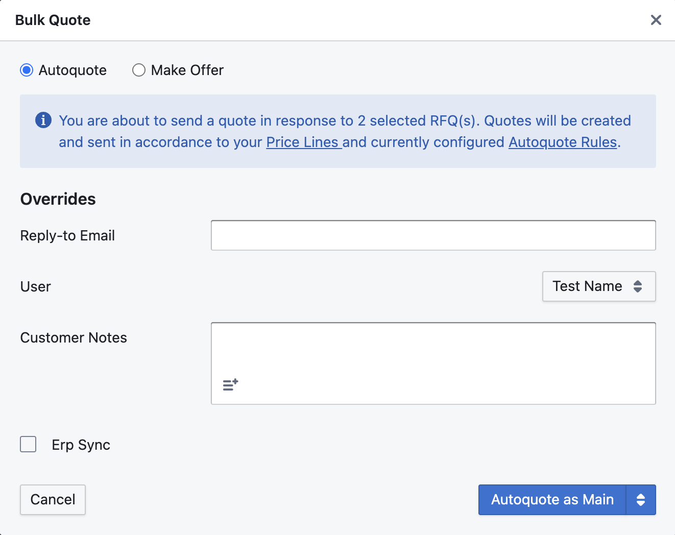 In order to send a quote with a price, the part number(s) you are quoting must be eligible for Autoquote- meaning you must have a price for it in your Price Lines and your Autoquote rule settings must allow for it to be quoted. Then just ensure you have Autoquote selected at the top and you can provide the Reply-to Email, choose a Rotabull user to send it from, and whether or not this quote will be synced to your ERP system. When you're ready, send the quotes by clicking "Autoquote as..." in the bottom right.