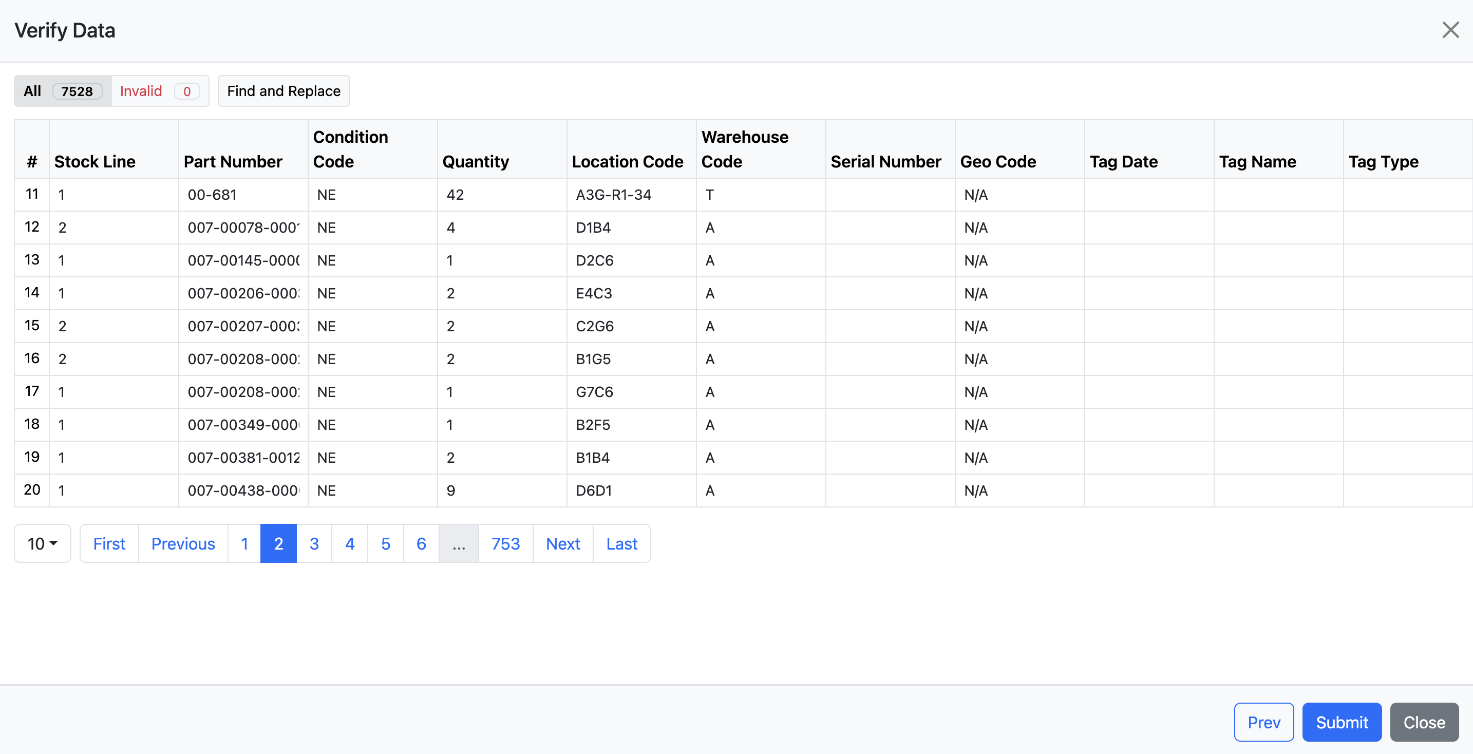 Click the "Invalid" in the top left to see if any of the rows in your spreadsheet need corrections before submitting the file. Invalid fields will be highlighted in red; you can choose to correct the errors or omit those rows entirely. If everything looks correct, click Submit to begin the upload.
