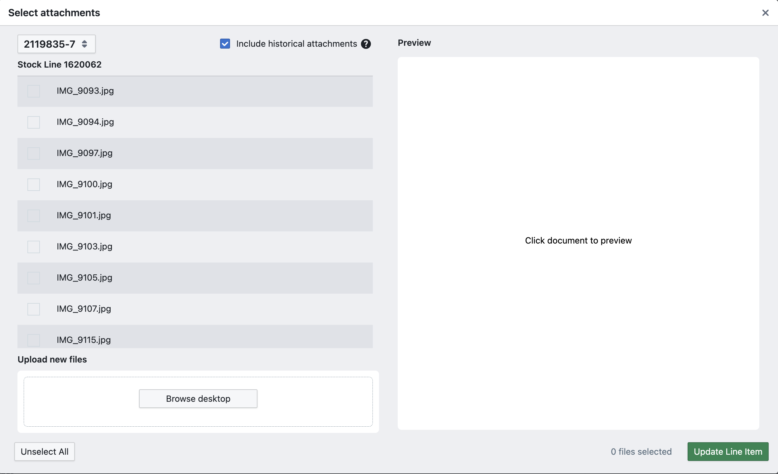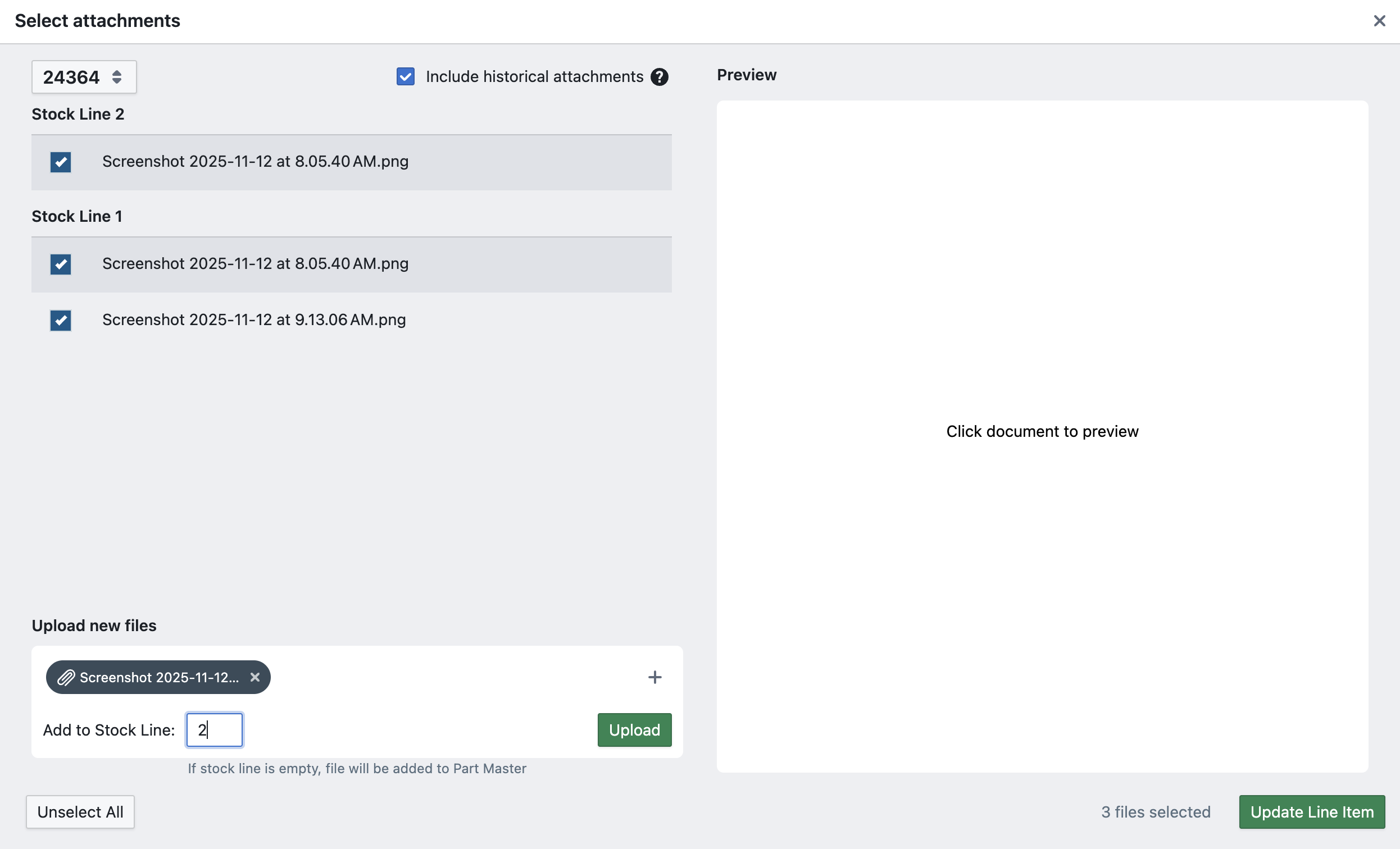 You can also click in the top-left to select documents for a different part number on the quote. Note that "Include historical attachments" defaults to on. When this setting is on, the window will display all documents that Rotabull has ever found in your ERP for this part, which may include stock lines that are no longer active in your ERP.
