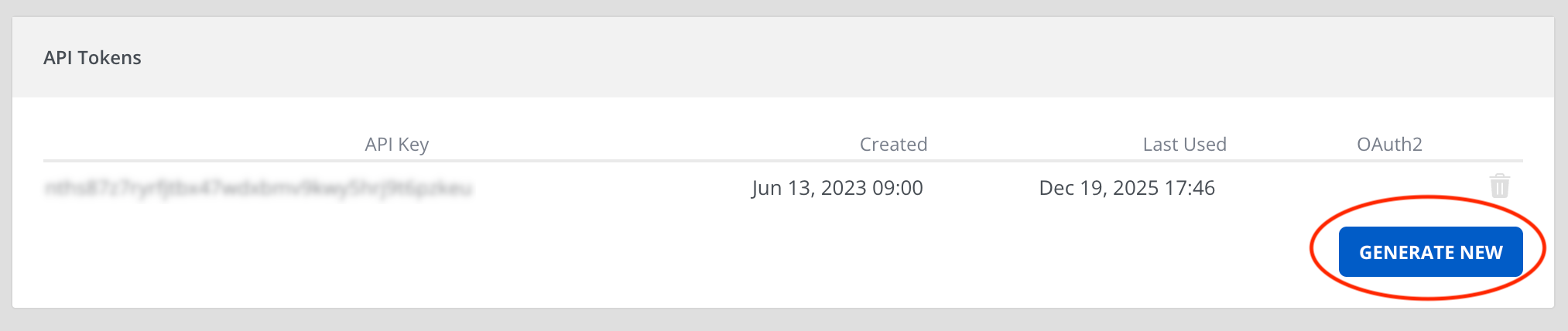 - At the top right of this page, you'll see a button that says Generate New. Click that to get your API credentials (key and secret):