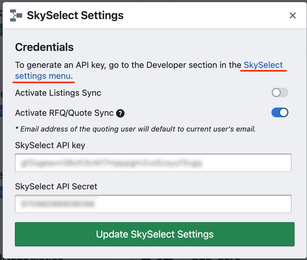 RFQs can be synced from SkySelect to Rotabull via SkySelect's API. You will need to have the SkySelect API Key and API secret on file with your Rotabull account to receive RFQs. Here's how to get started.
